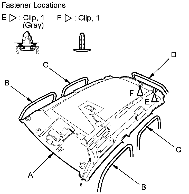 2. With the help of an assistant, detach the clips (E, F) by pulling the rear portion of the headliner down.