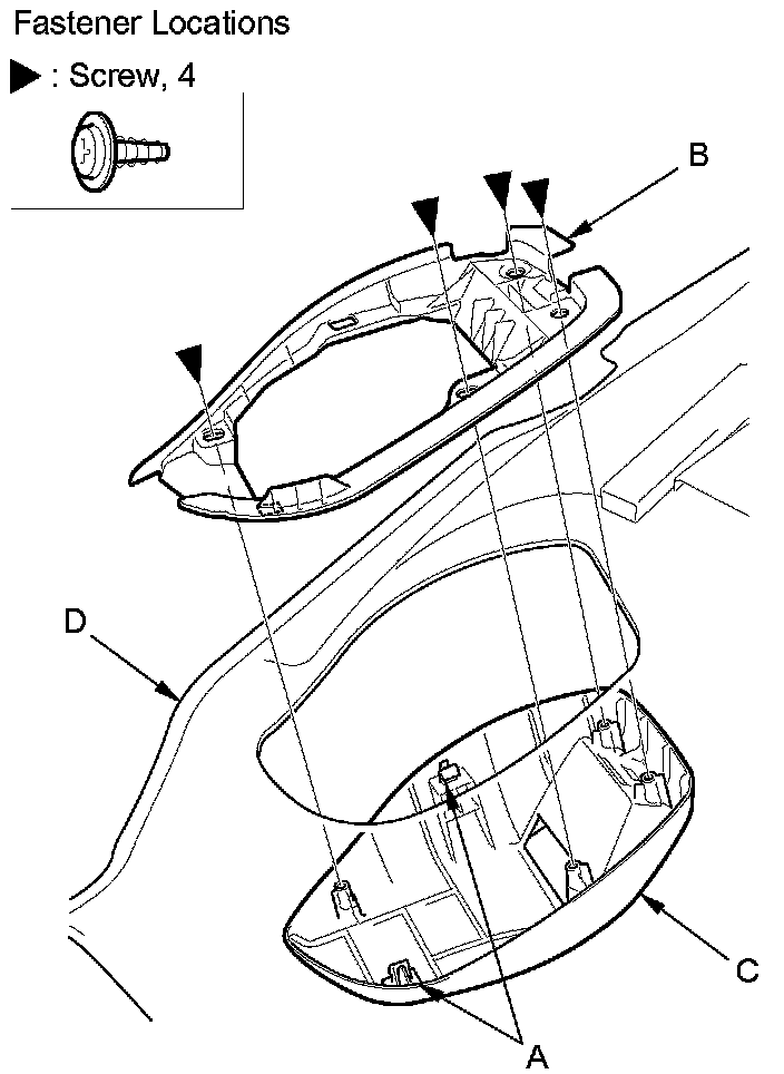 9. Remove the screws, and release the hooks (A), then remove the retractor cover bracket (B) and the retractor cover (C) from the headliner (D).