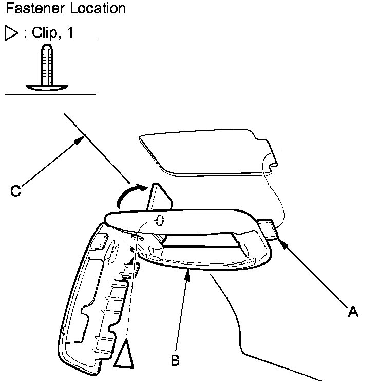 10. Remove the clip and release the hook (A), then remove the tether anchor cover (B) from the headliner (C).