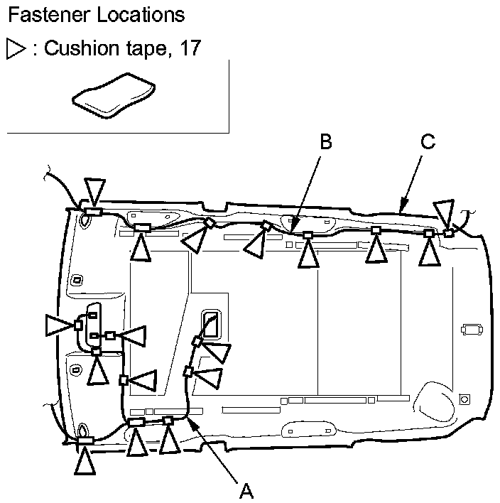 11. Remove the cushion tapes, then remove the roof wire harness (A) and the antenna lead (B) from the headliner (C).
