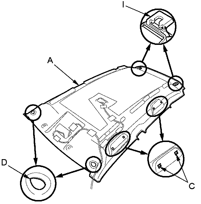 - Any damage around the grab handle holes (C) or sunvisor holes (D) in the headliner