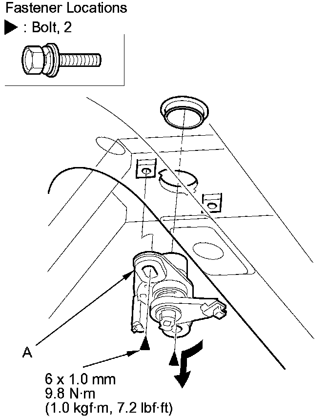 3. Remove the bolts securing the lock cylinder (A), then remove the lock cylinder by turning it.