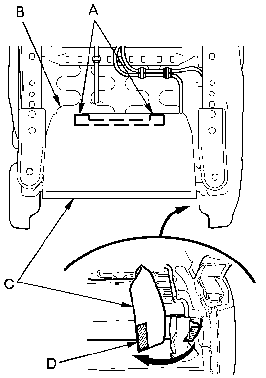 3. From under the seat cushion, release the hooks (A) from the seat cushion frame spring (B). Pull the cushion cover (C) back, and release the Velcro fastener (D).