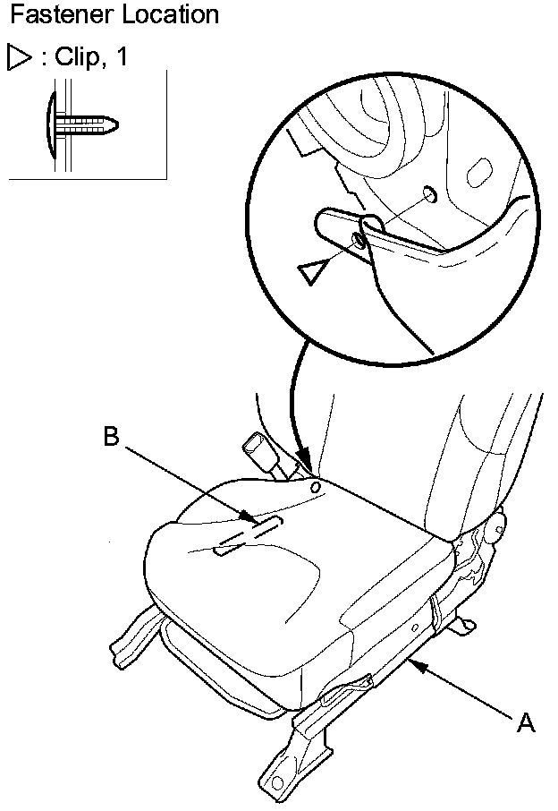 4. Remove the clip, then release the hook strips (A, B) from the seat cushion frame.