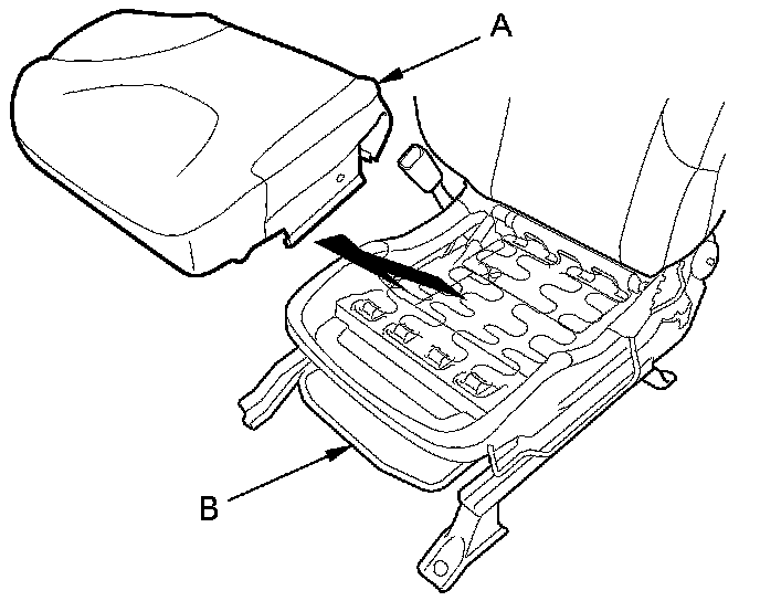 6. Remove the seat cushion cover/pad (A) from the seat frame (B).