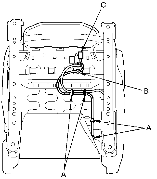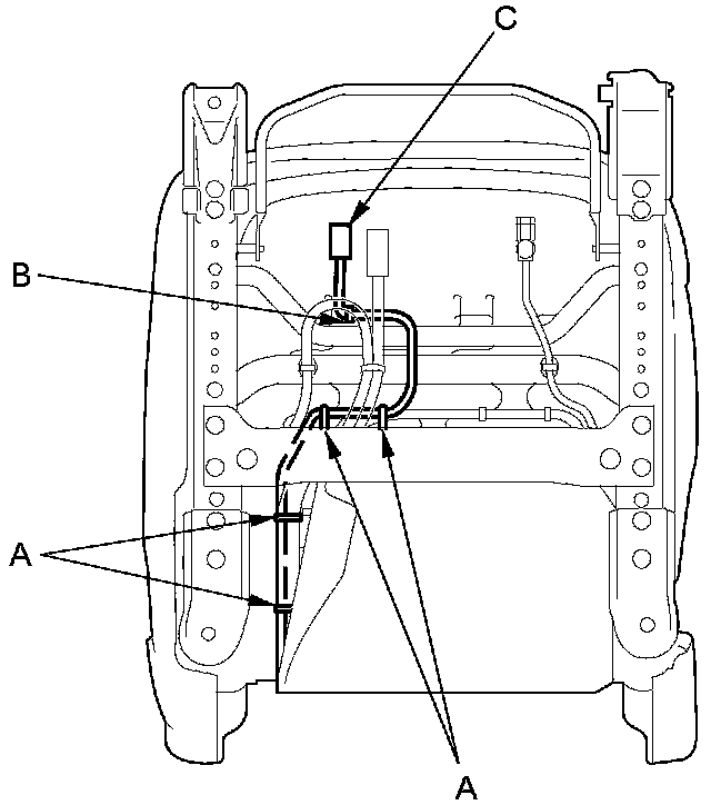 4. From under the seat cushion, remove the wire ties (A), and detach the wire harness clip (B) and the side airbag connector (C), then pull the wire harness out from under the seat cushion.