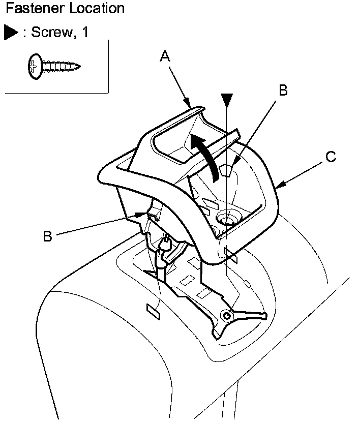 2. Release the hooks (B), and pull up the latch cover (C) from the rear seat-back.