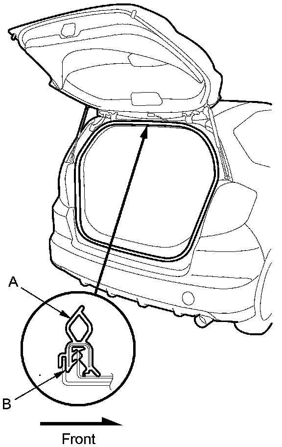 2. Locate the painted alignment mark (B) on the tailgate weatherstrip. Align the painted mark with the alignment tab in the center of the tailgate opening, and install the weatherstrip. Make sure it's seated completely and facing in the direction shown. Make sure there are no wrinkles in the weatherstrip.