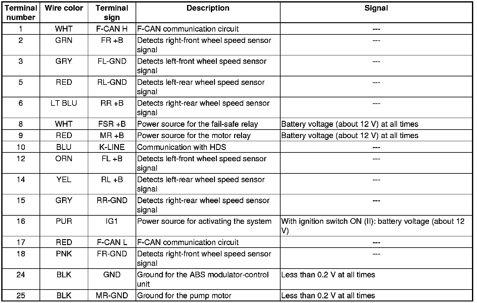 ABS Modulator-control Unit Inputs and Outputs for 25P Connector