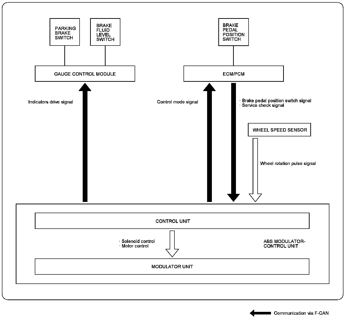 The ABS includes the ABS modulator-control unit, the wheel speed sensors, and the system indicators in the gauge control module. The ABS modulator-control unit controls the anti-lock brake and the brake distribution functions.