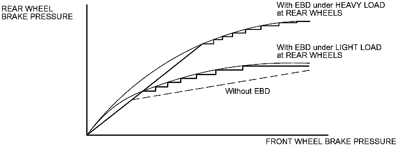 EBD feature helps control vehicle braking by adjusting the rear brake force in accordance with the rear wheel load before the ABS operates. Based on the wheel speed sensor signals, the control unit uses the modulator to control the rear brakes individually. When the rear wheel speed is less than the front wheel speed, the ABS modulator-control unit retains the current rear brake fluid pressure by closing the inlet valve in the modulator. As the rear wheel speed increases and approaches the front wheel speed, the ABS modulator-control unit increases the rear brake fluid pressure by momentarily opening the inlet valve. This whole process is repeated very rapidly. While this is happening, kickback may be felt at the brake pedal,and you may also hear a muted buzzing sound. This is normal.