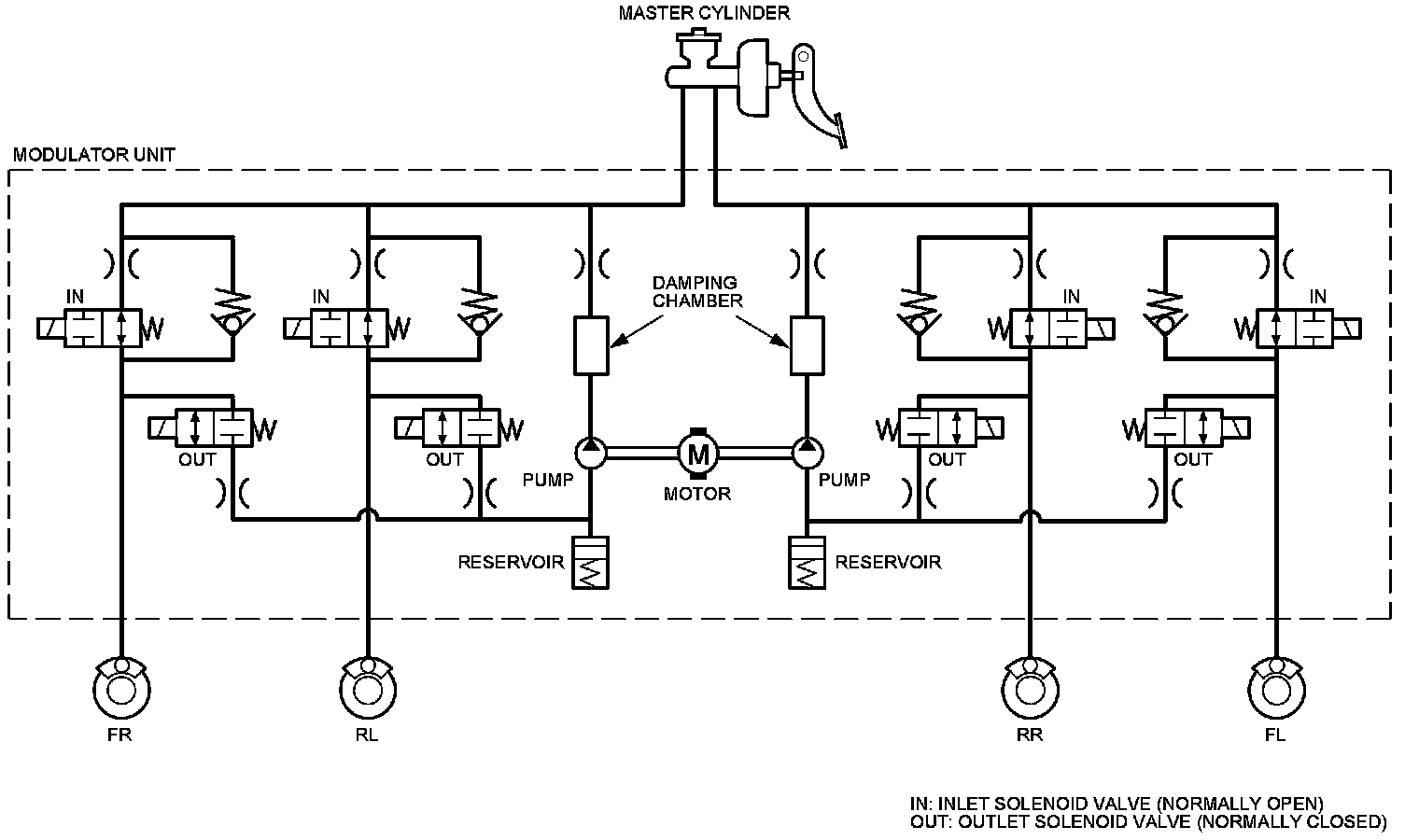 The ABS modulator consists of the inlet solenoid valve, the outlet solenoid valve, the reservoir, the pump, the pump motor, and the damping chamber. The modulator reduces the caliper fluid pressure directly. It is a circulating-type modulator because the brake fluid circulates through the caliper, the reservoir, and the master cylinder. The hydraulic control has three modes: pressure intensifying, pressure retaining, and pressure reducing. The hydraulic circuit is an independent four channel type, one channel for each wheel.