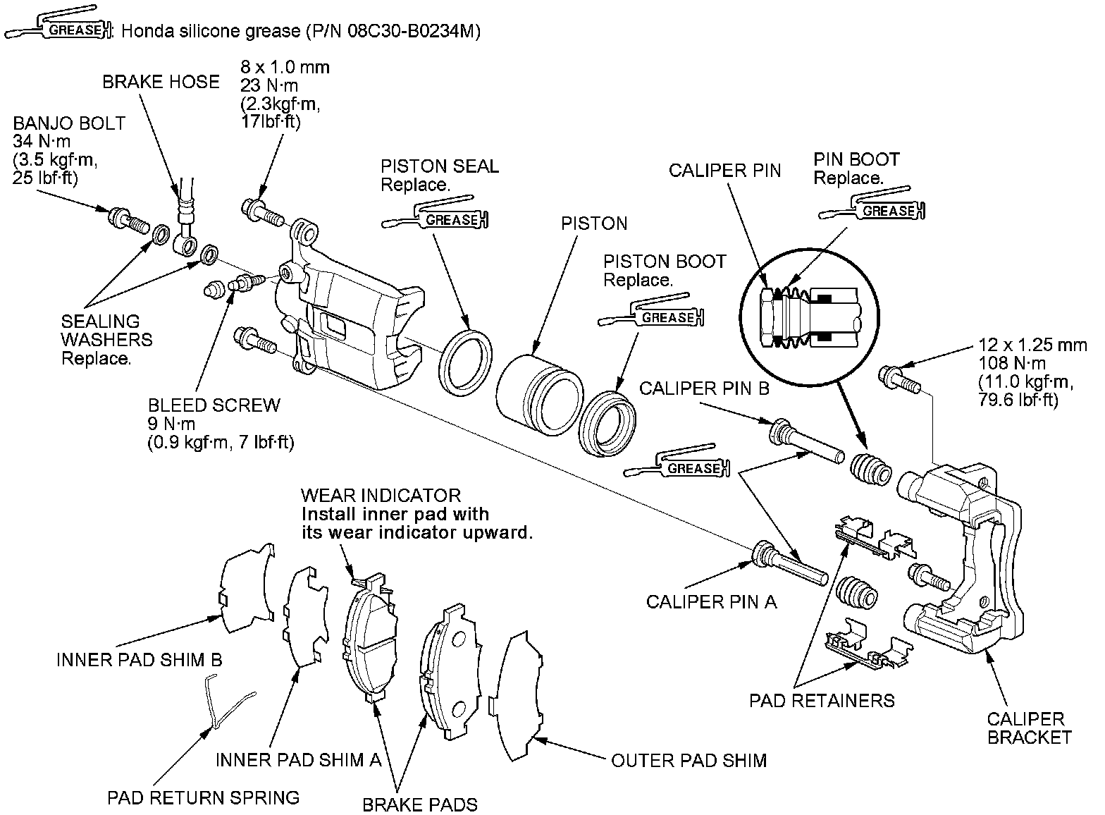 NOTE: Make sure that the caliper pins are installed correctly. Upper caliper pin B and lower caliper pin A are different. If these caliper pins are installed in the wrong location, it will cause vibration, uneven or rapid pad wear, and possibly uneven tire wear.