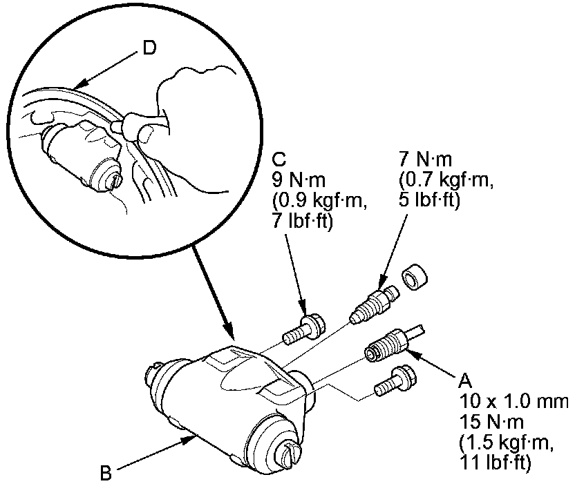 4. Apply Cemedine 366E sealant or equivalent between the wheel cylinder and backing plate (D), and install the wheel cylinder, then connect the brake line.