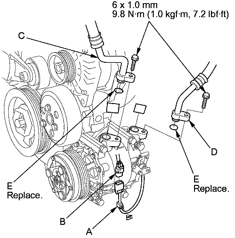 5. Remove the compressor clutch harness clump (A) from the condenser fan shroud, then disconnect the compressor clutch connector (B). Remove the bolts, then disconnect the suction line (C) and the discharge line (D) from the A/C compressor, and remove the O-rings (E). Plug or cap the lines immediately after disconnecting them to avoid moisture and dust contamination.