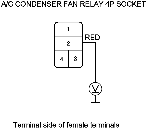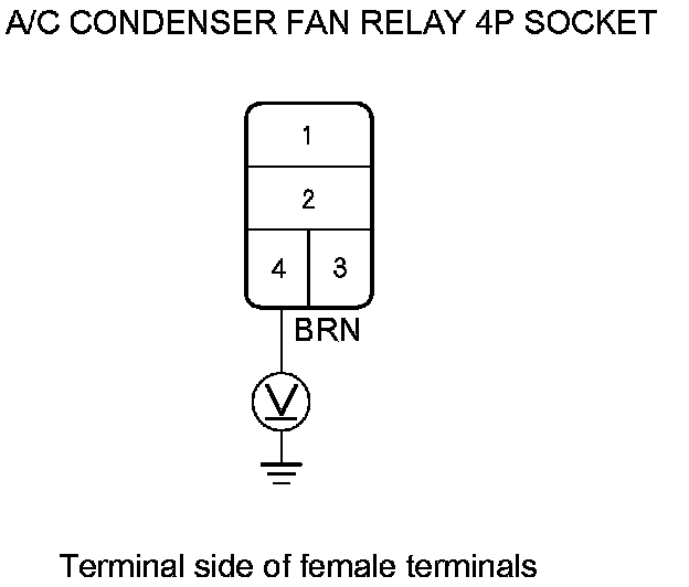3. Measure the voltage between A/C condenser fan relay 4P socket terminal No. 2 and body ground.