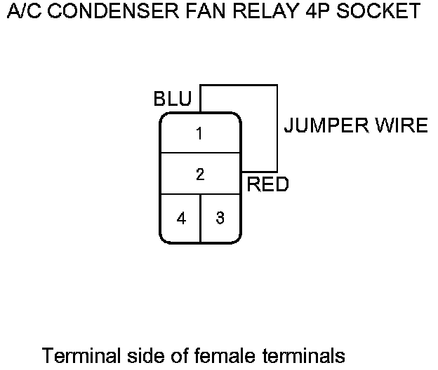 4. Connect the A/C condenser fan relay 4P socket terminals No. 1 and No. 2 with a jumper wire.