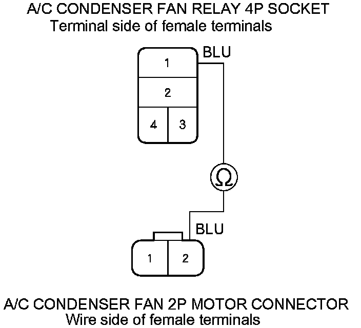 10. Check for continuity between A/C condenser fan relay 4P socket terminal No. 1 and A/C condenser fan motor 2P connector terminal No. 2.