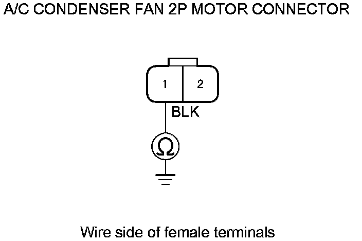 11. Check for continuity between A/C condenser fan 2P motor connector terminal No. 1 and body ground.