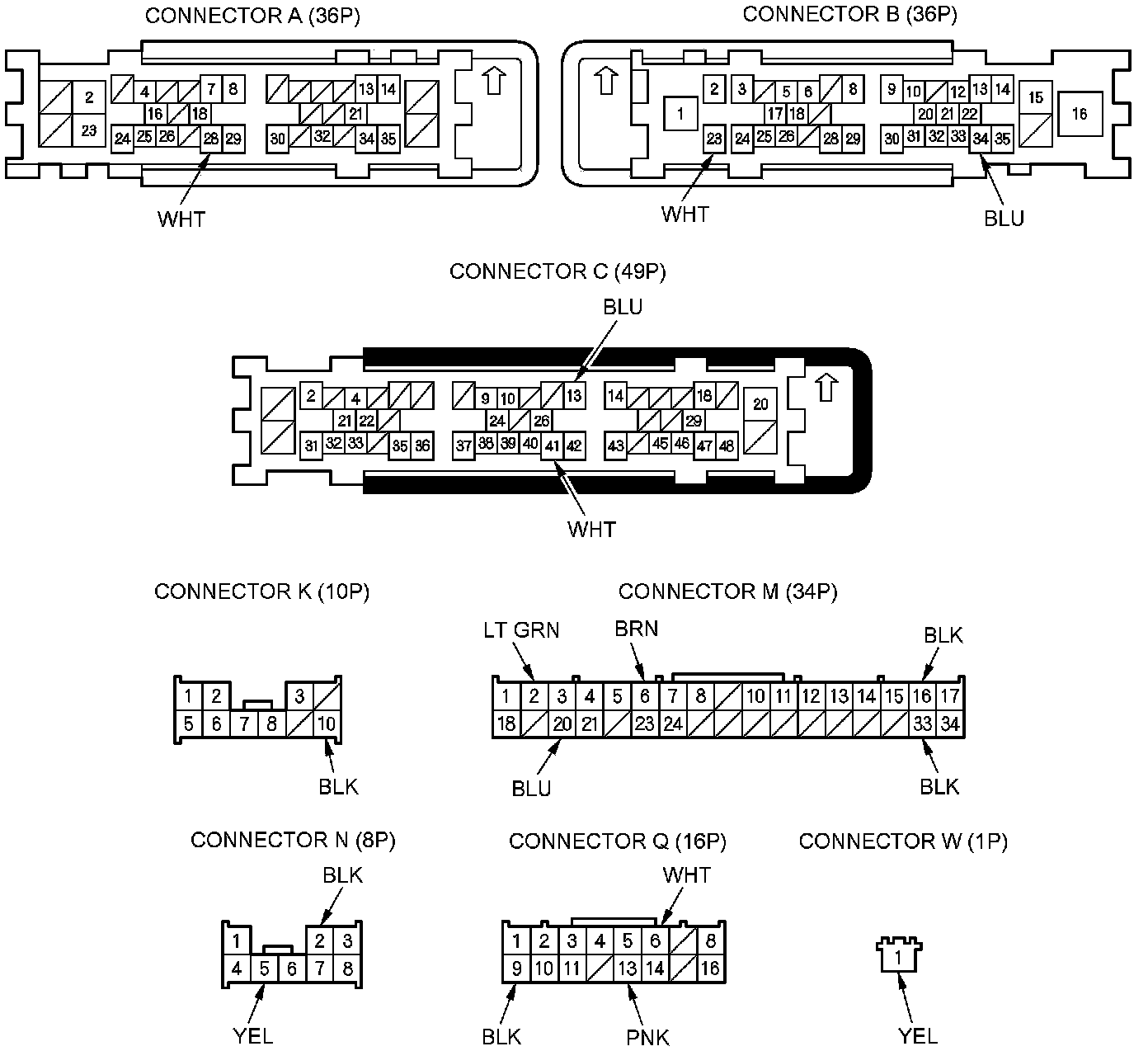 NOTE: All connector views are shown from wire side of female terminals.