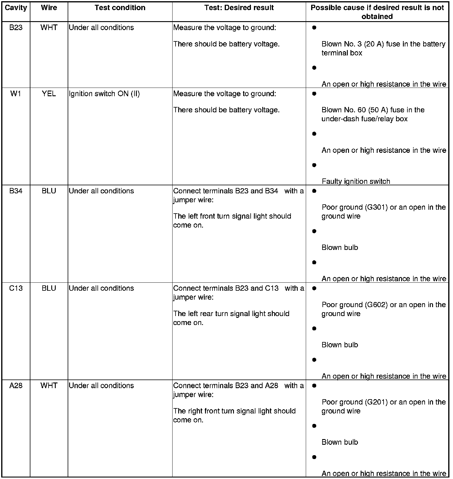 NOTE: Before testing, check the No. 1 (7.5 A), No. 22 (7.5 A), and No. 23 (10 A) fuse in the under-dash fuse/relay box.