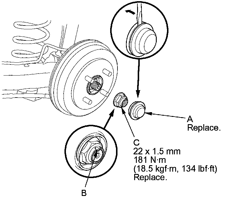 4. Remove the hub cap (A). Raise the stake (B), then remove the spindle nut (C).