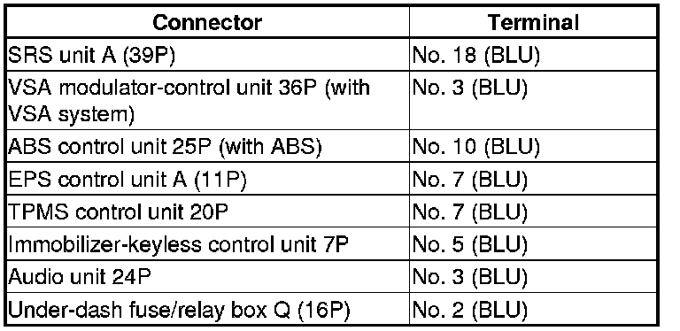 Repair short in the wire between the DLC (K-line) and the ABS modulator-control unit (with ABS), the VSA modulator-control unit (with VSA system), the SRS unit, the EPS control unit, the TPMS control unit, the immobilizer-keyless control unit, the audio unit, the under-dash fuse/relay box, or the ECM/PCM.�