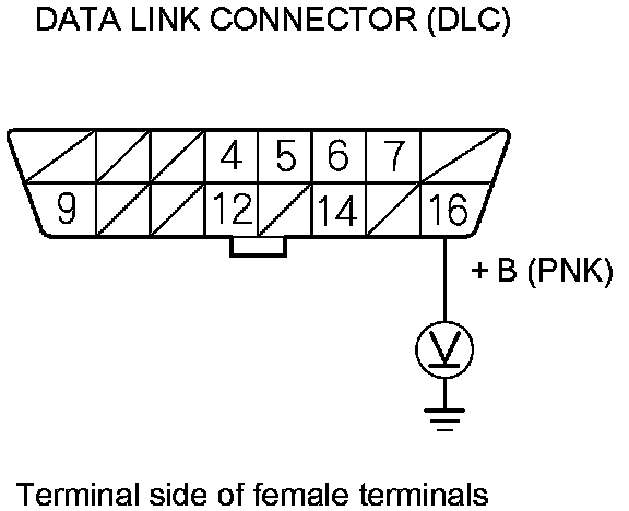 28. Measure the voltage between DLC terminal No. 16 and body ground.
