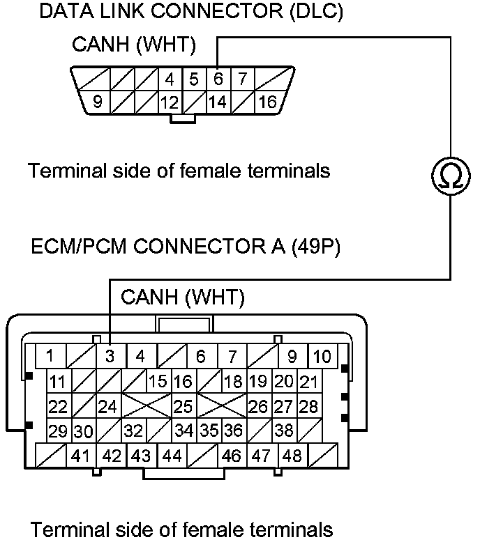 34. Check for continuity between ECM/PCM connector terminal A3 and DLC terminal No. 6.