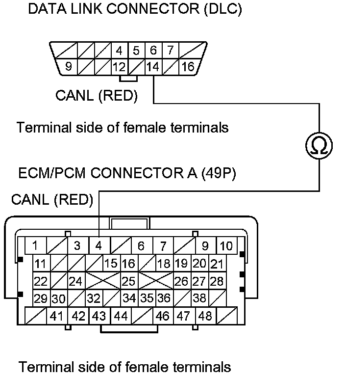 35. Check for continuity between ECM/PCM connector terminal A4 and DLC terminal No. 14.