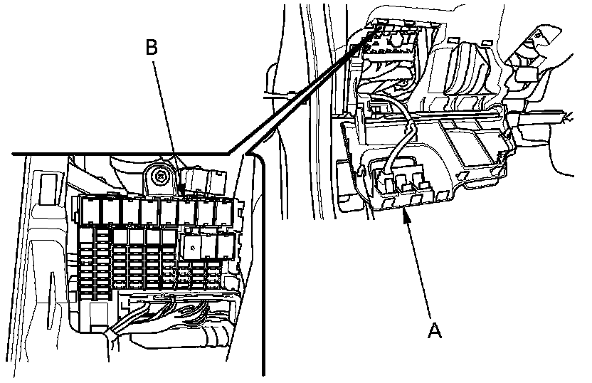 48. Open the fuse access panel (A), then remove PGM-FI main relay 2 (B) from the under-dash fuse/relay box.