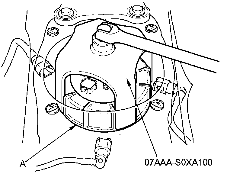 4. Using the special tool, tighten a new locknut (A) with a new locknut plate (B) to the specified torque.