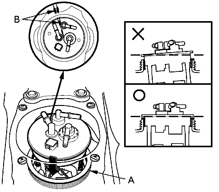 3. Align the marks (B) on the fuel tank and fuel tank unit, then insert the fuel tank unit into the fuel tank until the fuel tank unit rests on top of the base gasket.
