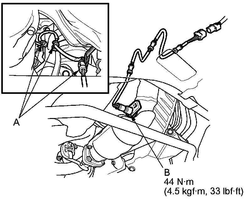 3. Remove the supporters (A), then remove the secondary HO2S (B).