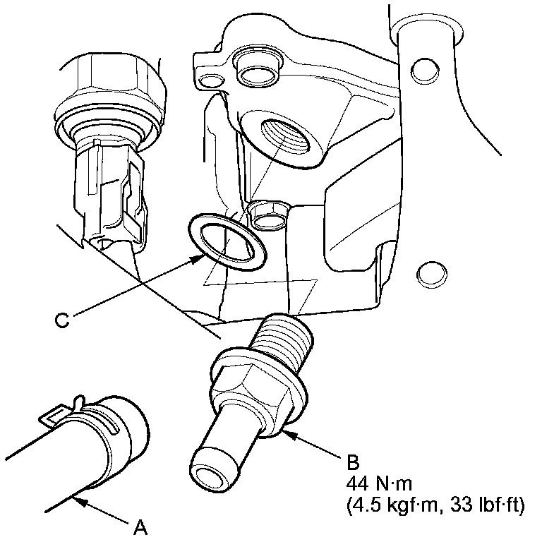 4. Install the parts in the reverse order of removal with a new 14 mm washer (C).