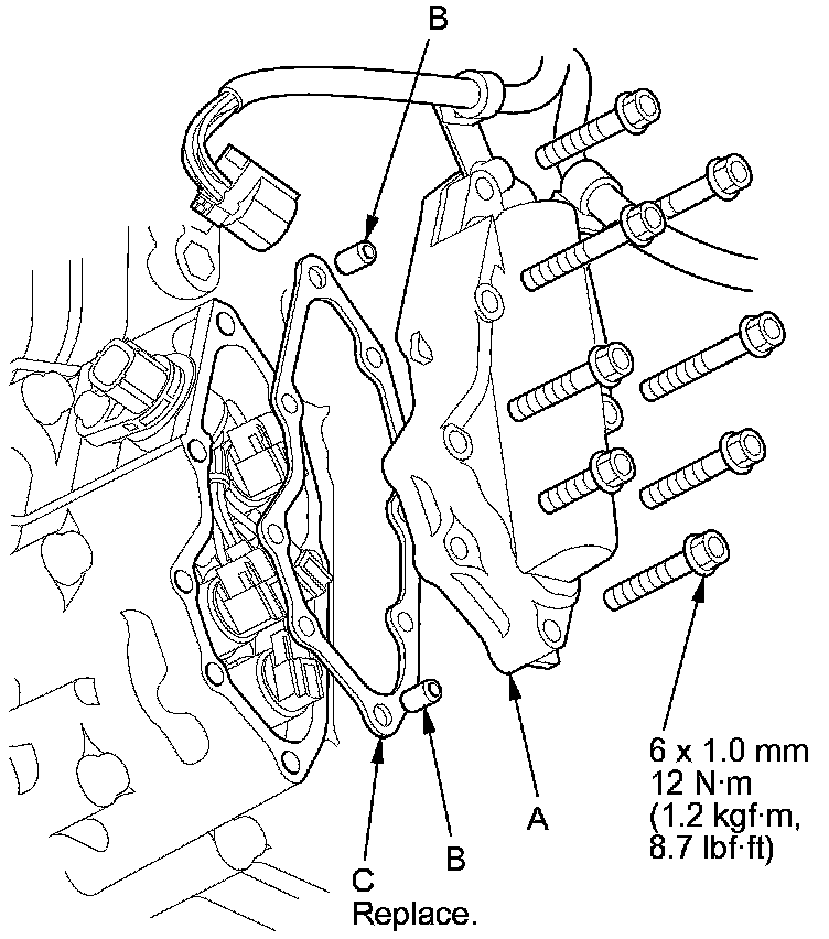 8. Remove the shift solenoid valve cover (A), the dowel pins (B), and the gasket (C).
