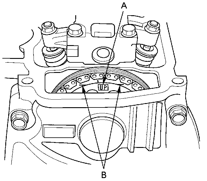 2. Set the No. 1 piston at top dead center (TDC). The "UP" mark (A) on the camshaft sprocket should be at the top, and the TDC grooves (B) on the camshaft sprocket should line up with the top edge of the head.
