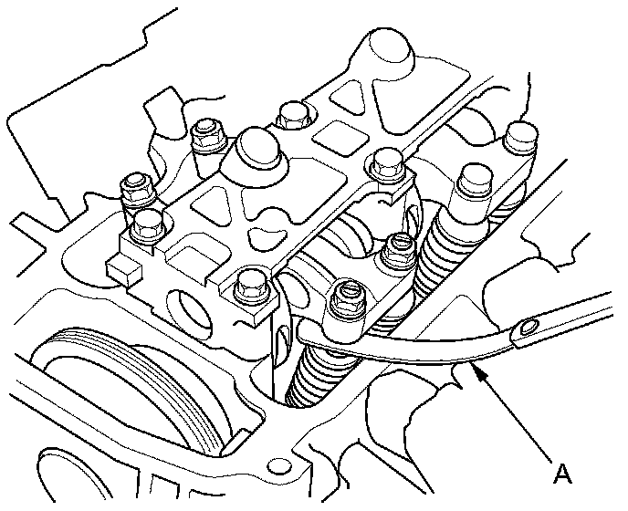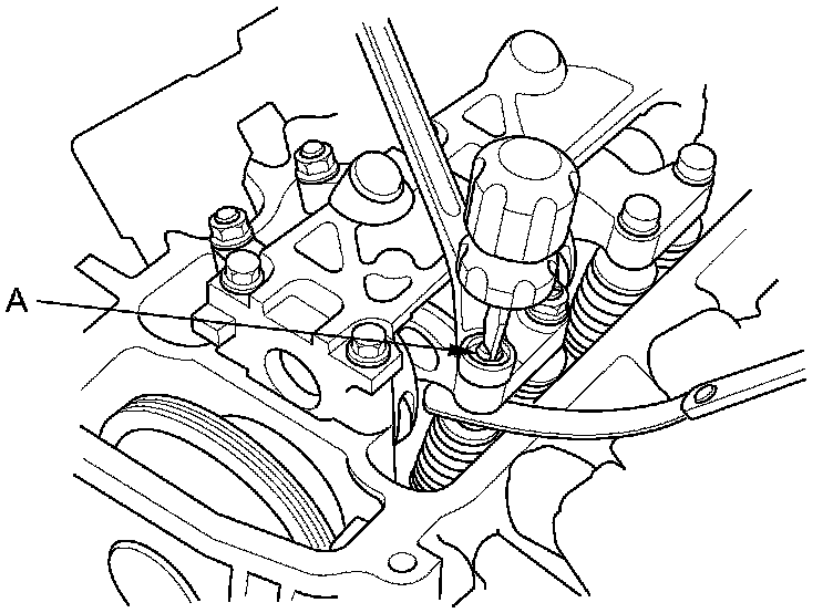 4. Insert the feeler gauge (A) between the adjusting screw and the end of the valve stem on No. 1 cylinder and slide it back and forth; you should feel a slight amount of drag.
