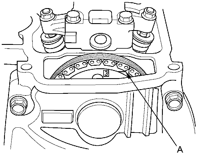 8. Rotate the crankshaft clockwise. Align the No. 3 piston TDC groove (A) on the camshaft sprocket with the top edge of the head.