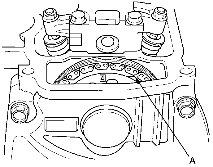 10. Rotate the crankshaft clockwise. Align the No. 4 piston TDC groove (A) on the camshaft sprocket with the top edge of the head.