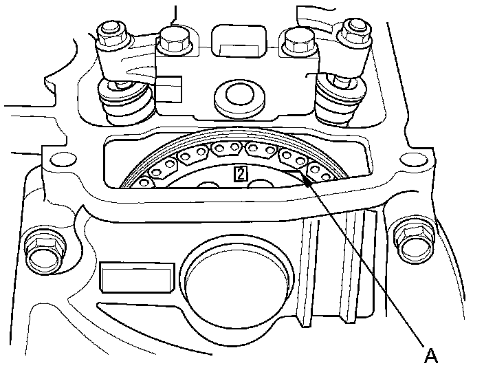 12. Rotate the crankshaft clockwise. Align the No. 2 piston TDC groove (A) on the camshaft sprocket with the top edge of the head.