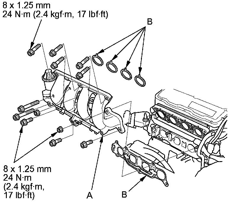 (A) with new gaskets (B), and tighten the bolts and nuts in a crisscross pattern in three steps, beginning with the inner bolt.