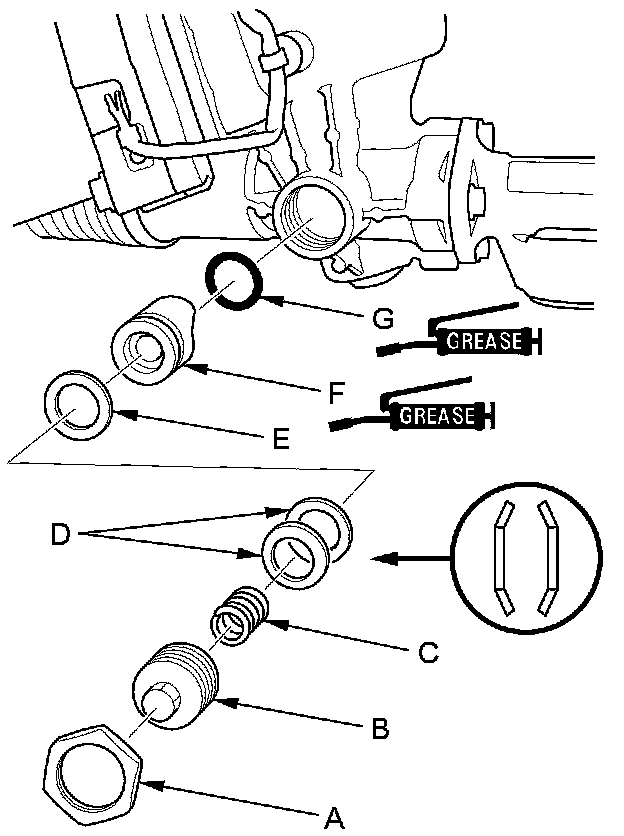 2. Loosen the locknut (A), then remove the rack guide screw (B), the spring (C), the conical springs (D), the plain washer (E), and rack guide (F).