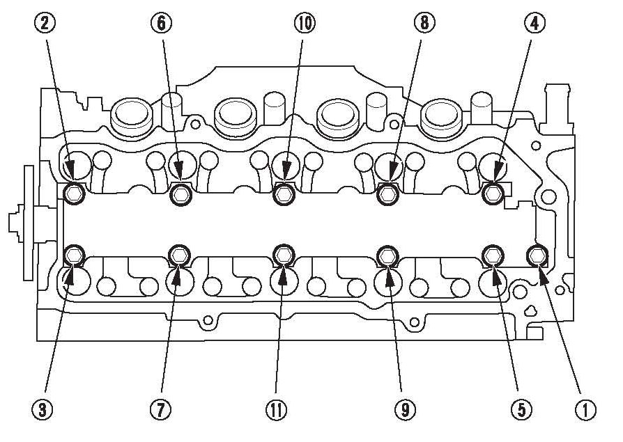 10. To avoid breaking the rocker shaft mounting bolts, unscrew them two turns at a time in the sequence shown.