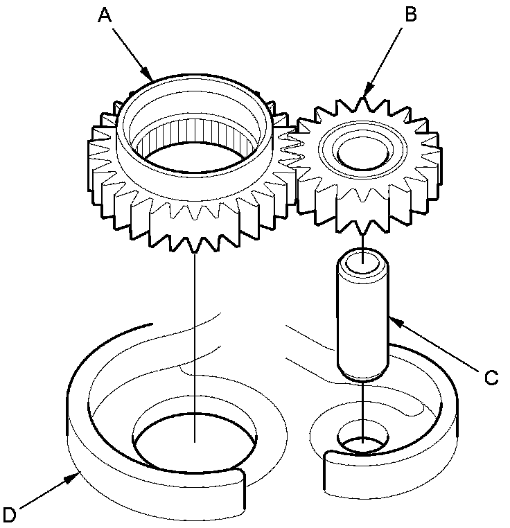1. Install the ATF pump drive gear (A), the driven gear (B), and the ATF pump driven gear shaft (C) in the main valve body (D). Lubricate all parts with ATF, and install the ATF pump driven gear with its grooved and chamfered side facing up.