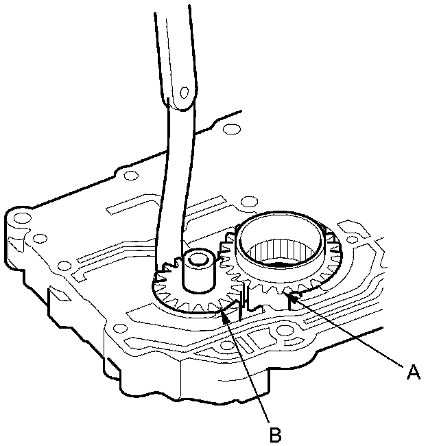 2. Measure the side clearance of the ATF pump drive gear (A) and the driven gear (B).