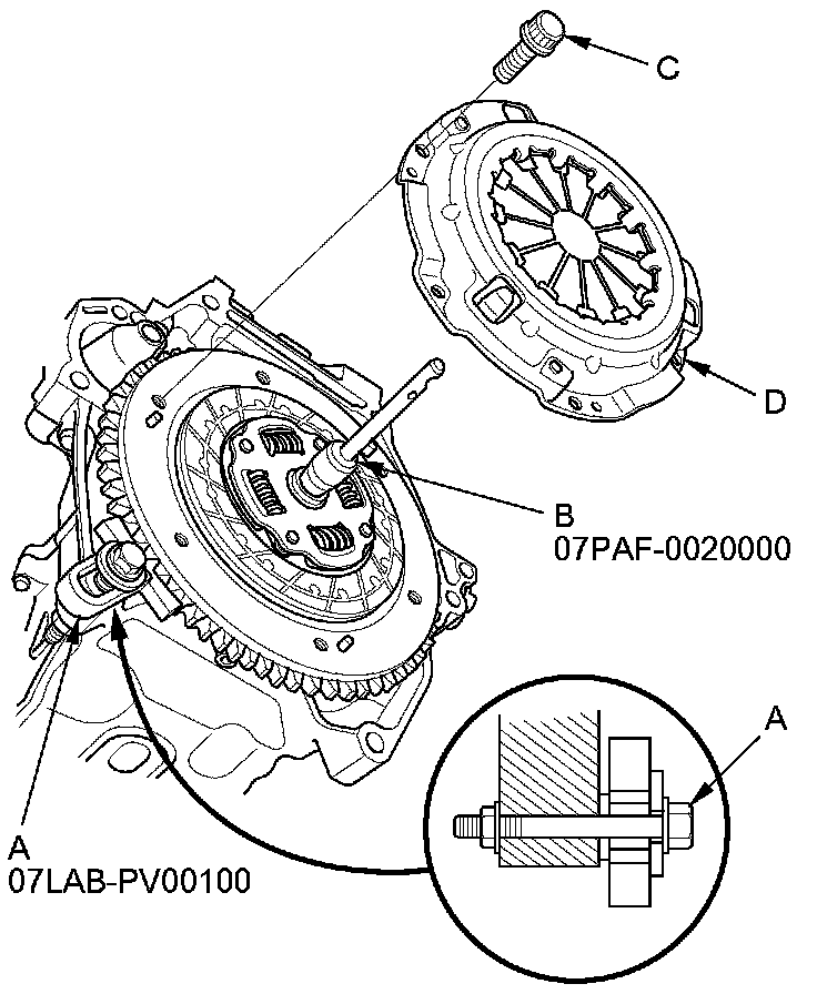 4. To prevent warping, unscrew the pressure plate mounting bolts (C) in a crisscross pattern in several steps, then remove the pressure plate (D).