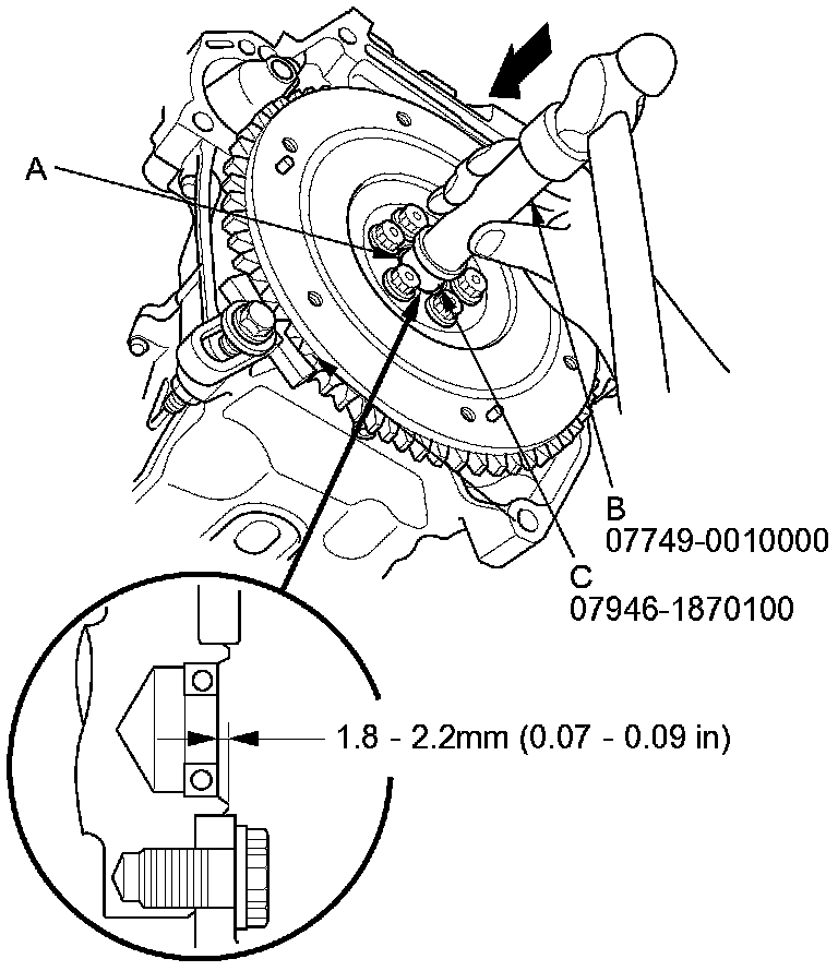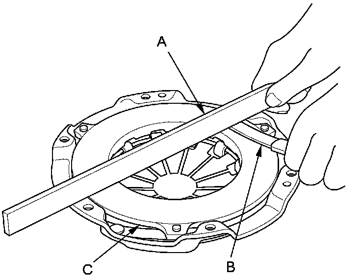 7. Inspect for warpage using a precision straight edge (A) and feeler gauge (B). Measure across the pressure plate (C). If the warpage is more than the service limit, replace the pressure plate.