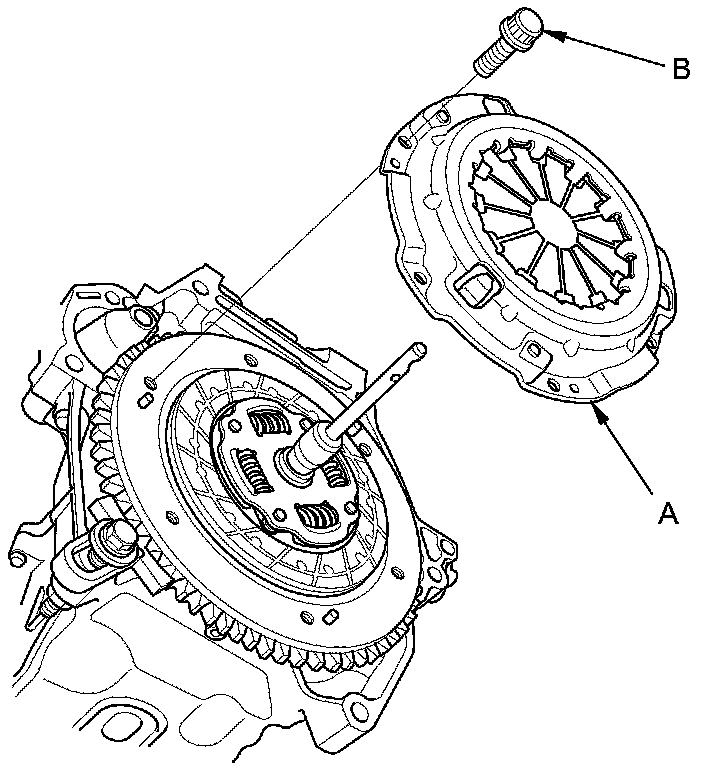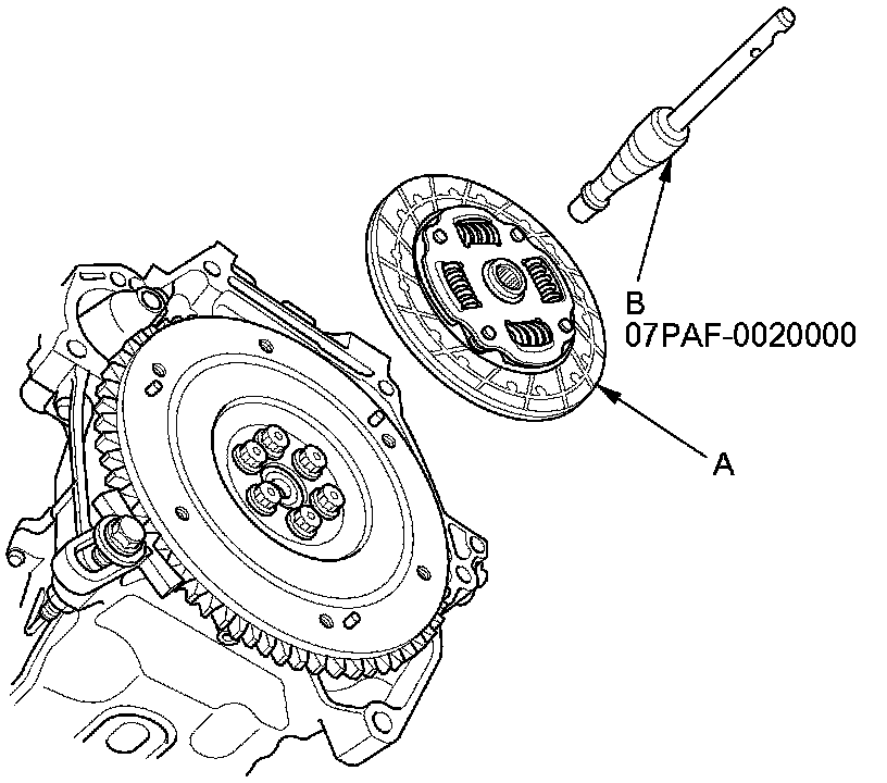 8. Remove the clutch disc (A) and the clutch alignment tool set (B).