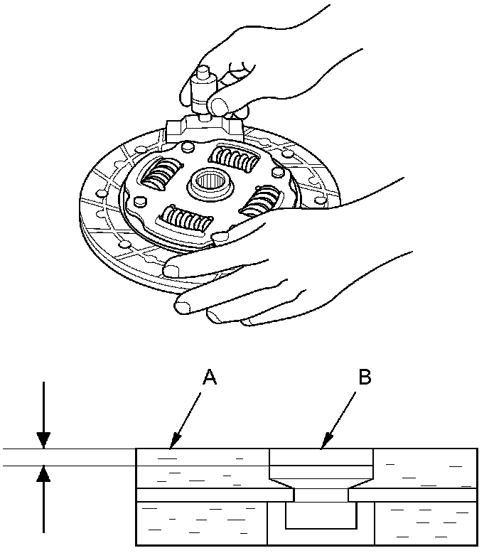 11. Measure the rivet depth from the clutch disc lining surface (A) to the rivets (B) on both sides. If the measurement is less than the service limit, replace the clutch disc.